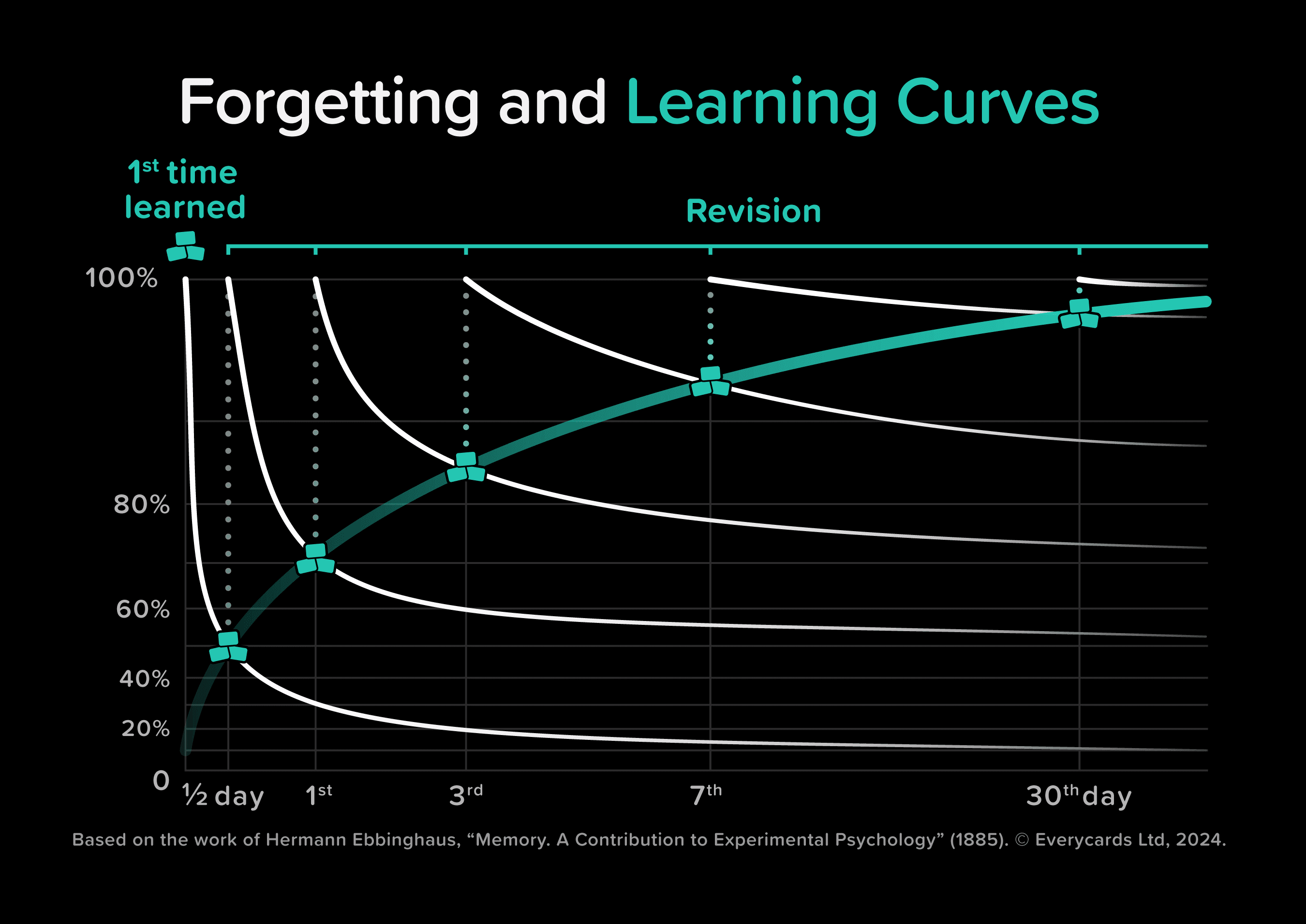 He presented the results of his experiment in the article Über das Gedächtnis (“On Memory”), 1885. Andrew, the founder of Everycards, drew a diagram for you based on the conclusions from that article: