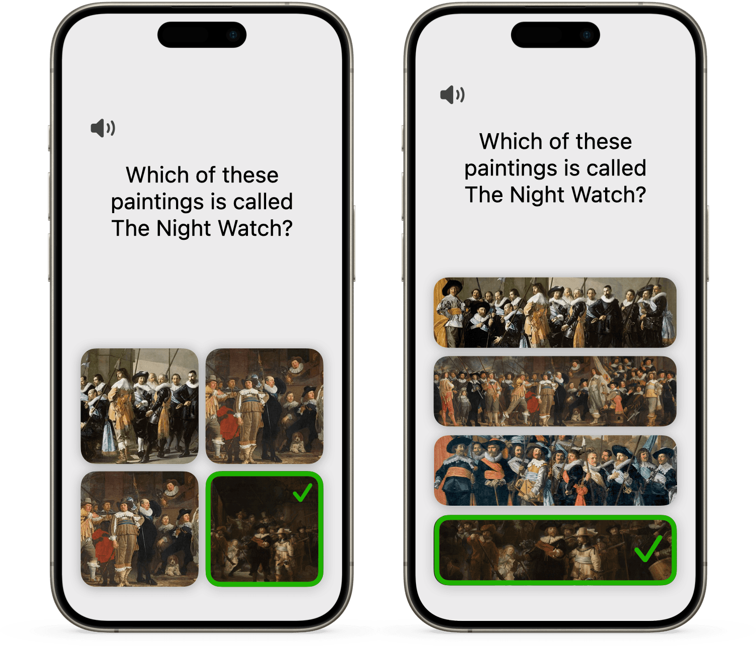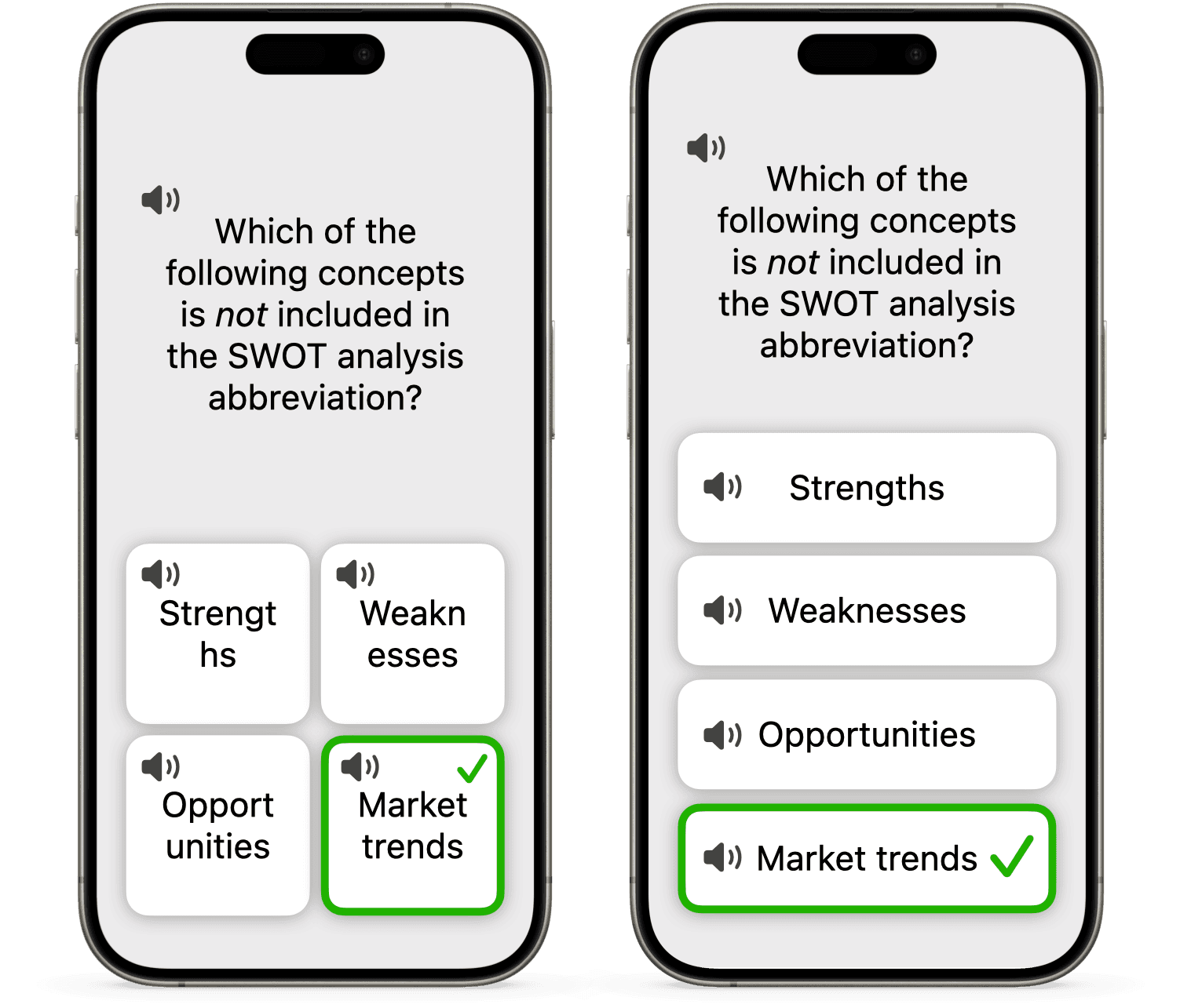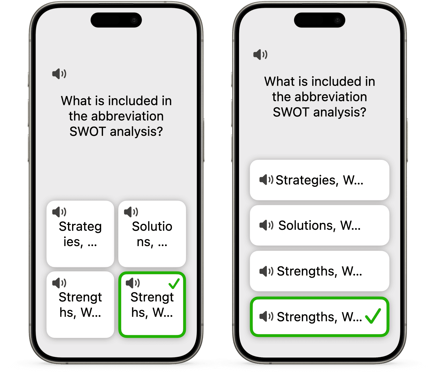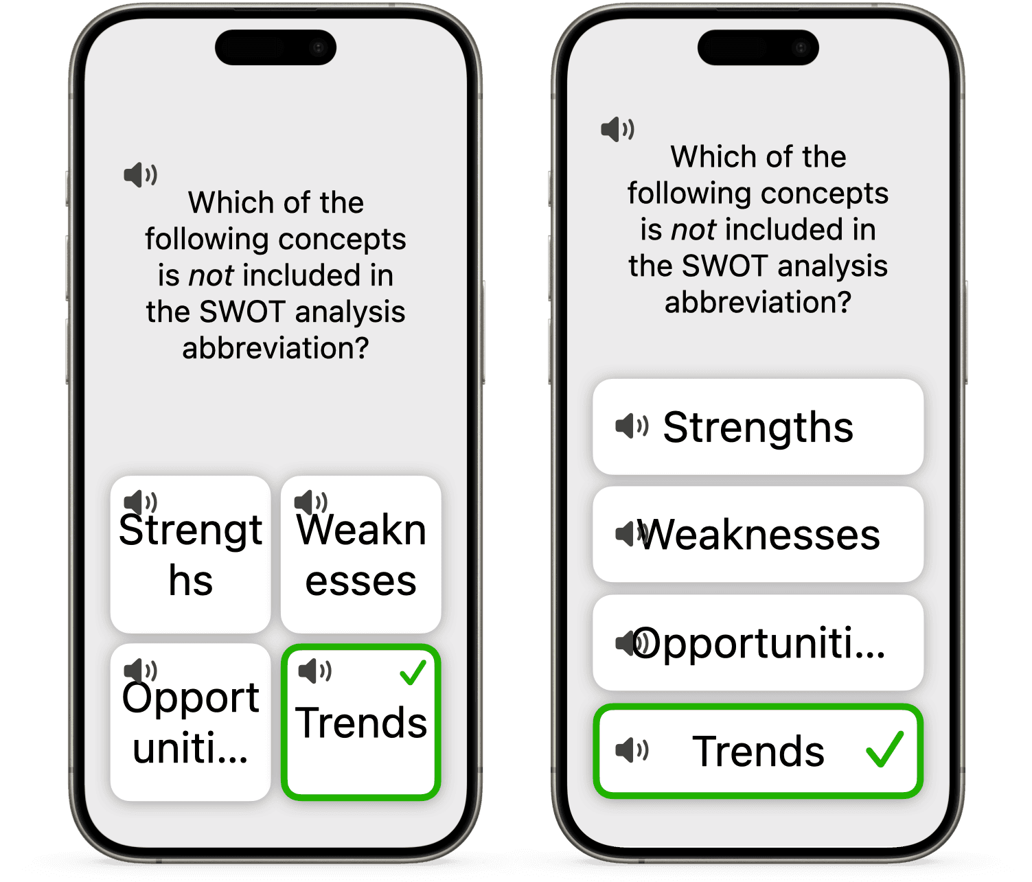 • If the quiz authors want the answers to be images, it doesn’t look very legible on small buttons.